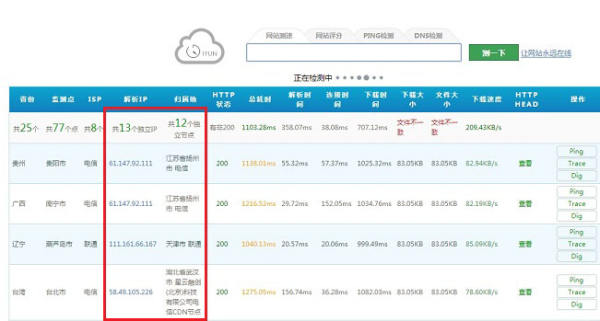 如果测试一个网址不同地区是不同的解析IP,那么说明这个网站开启了CDN加速,并且可以看到不同地区打开所花费的时间,这里也可以看出速度。