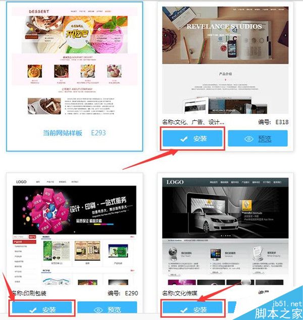 第二步、进入编辑页面,安装样板网站。 样板网站是建站公司已经做好的漂亮网站,挑选一个你喜欢的进行安装,只需要更换样板网站图片和文章即能完成网站,非常快速简单。
