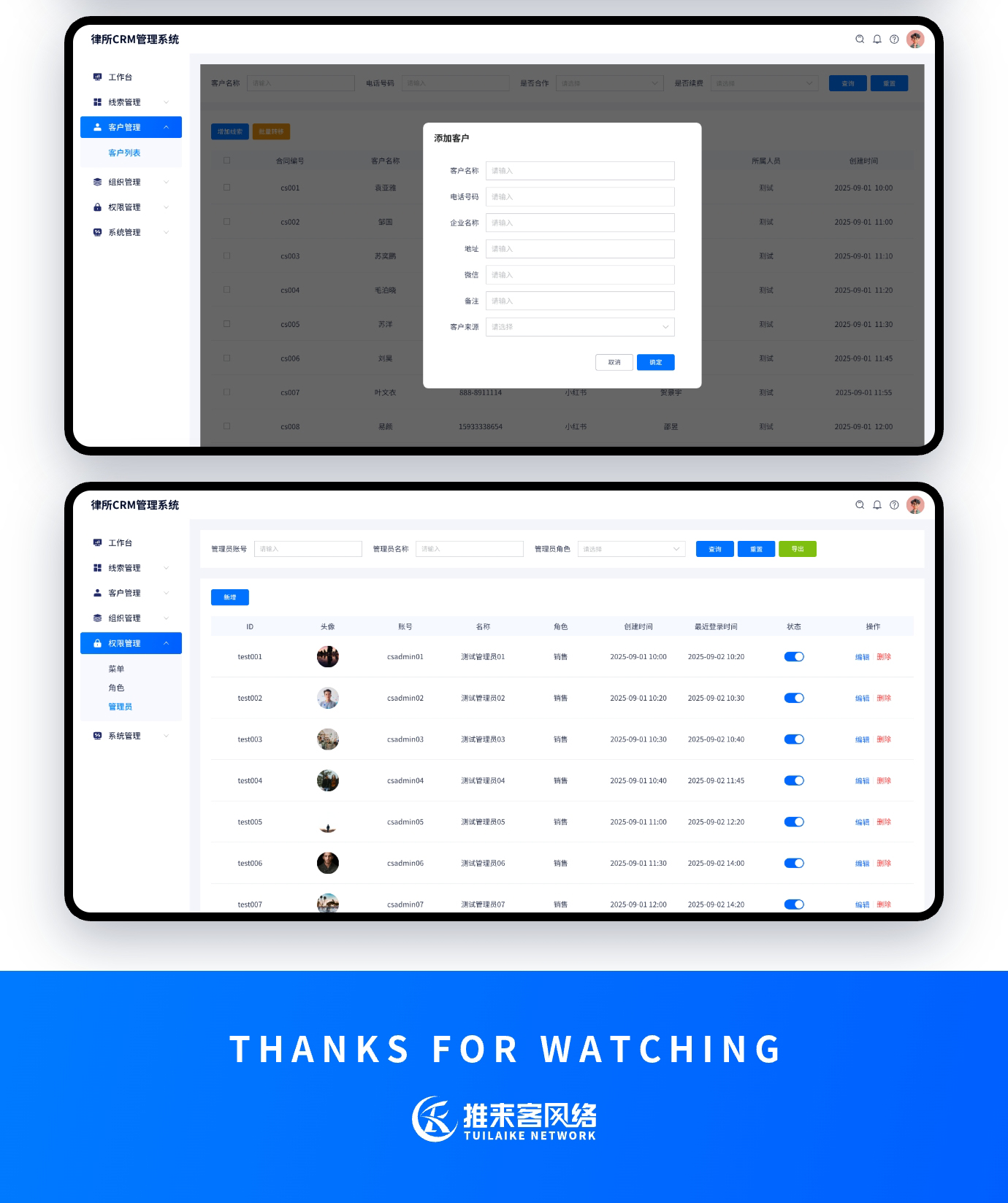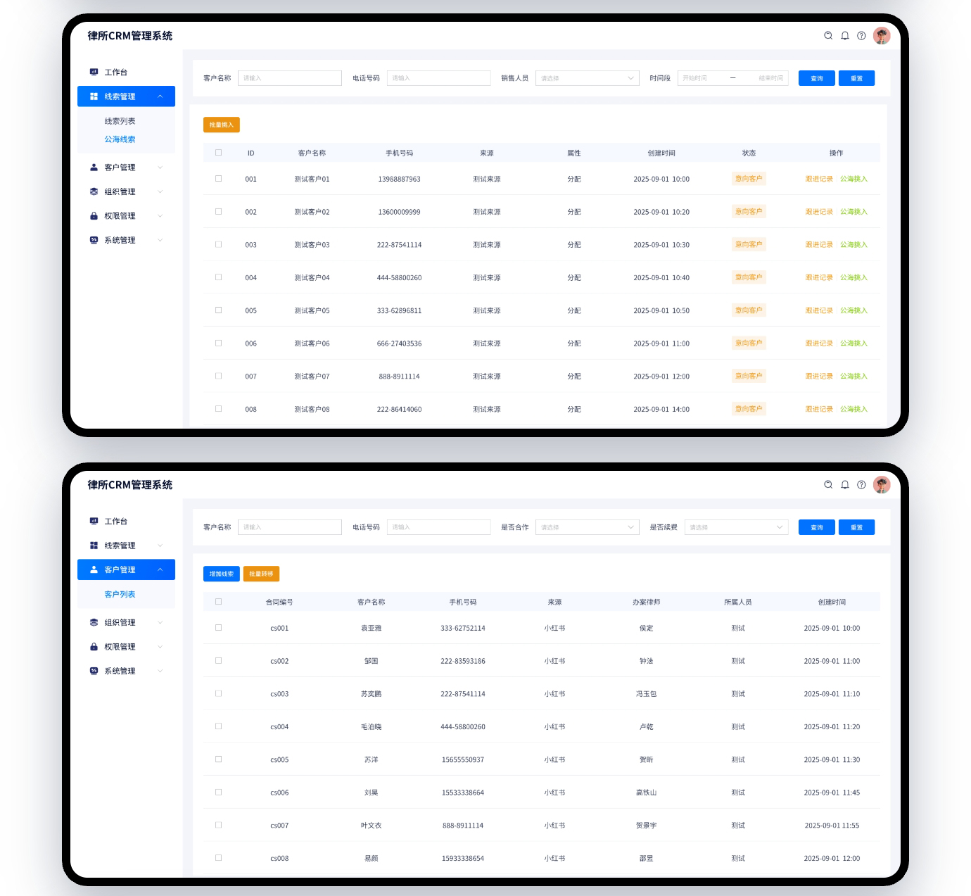 这是我们给成都一家律所开发的一套内部客户管理系统,主要功能就是潜在客户管理合已签约客户的管理。能对销售有量化的数据,对已签约的客户数据进行详细的记录,方便后期对客户的二次开发和跟进。
