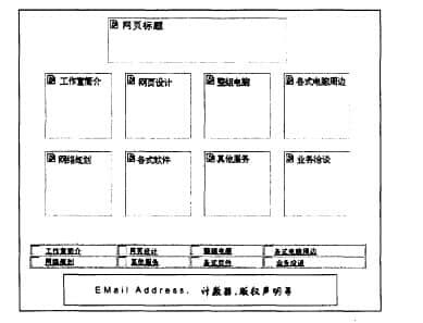 一般来说,建议大家先画一个简单的草图,在纸上安排好各个部件的位置和大小,这样有助于大家在实际设计工作中使用各种软件。以一个简单的网站布局为例,我们可以在页面上放置一个网站标题,标题下方显示六个超链接图标选项,图标下方显示一个文本超链接。最后,将E-mail Address、版权声明、counter、页面最后更新日期等附加信息放在页面底部,布局完成。