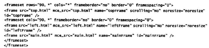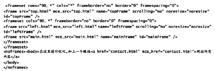 从上面的代码我们可以看出,导航主要是通过调用top.html和left.html在网站上展示,而网站的主要内容是通过调用main.html文件来展示的,但是搜索引擎无法抓取导航和网站内容,只能抓取上面显示的代码。这些代码对于网站优化是没有意义的,不可能在搜索引擎中得到好的排名。因此,对于大多数SEO来说,网站的框架结构是SEO优化的一大劣势。建立网站时,一定要与网站开发者沟通。一些网站开发者为了自己的方便,将网站设计成框架结构。这些人只从自己的角度考虑问题,不会考虑公司的利益,但是作为公司的老板,一定要站在SEO的角度去开发网站,因为网站不盈利,就失去了做网站的意义存在。框架结构并非没有解决方案。可以采用一些SEO技术手段,使框架优化存在并保持网站原有框架,从而完成框架结构优化。上面的代码可以修改如下图: