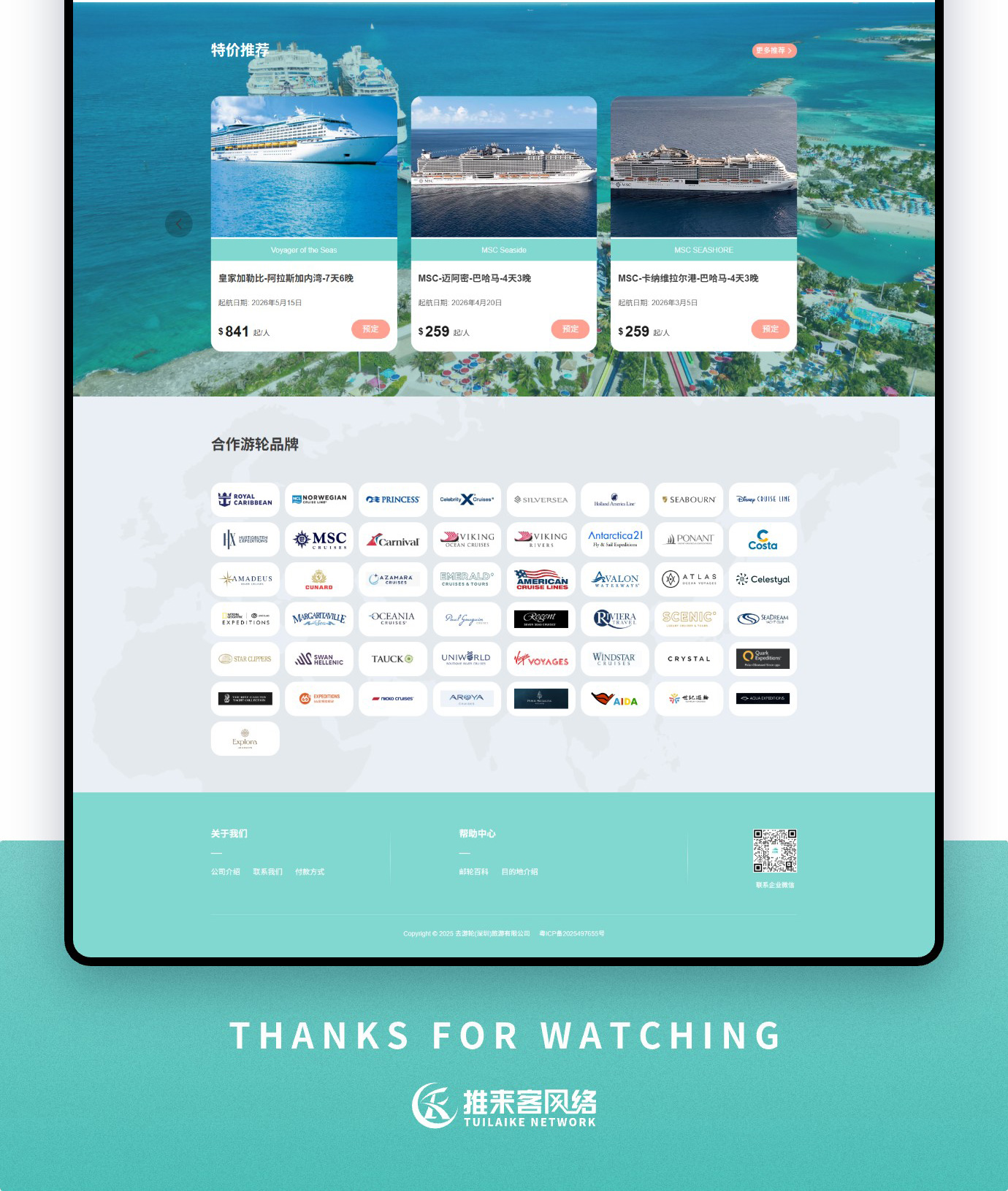 专注直连全球游轮预订的专业平台,汇聚全球主流游轮公司与热门航线,通过强大而简单的搜索系统,帮助用户快速比较航线与价格,轻松找到最低价和最合适的选择。平台实时直连各大主流游轮公司,实现一站式快速预订,并提供24小时专业游轮顾问客服,让你轻松开启最适合自己的海上假期!