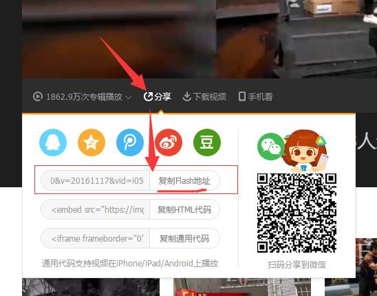 复制‘FLASH地址’表格分享代码。本分享方式是将视频转为SWF格式的FLASH视频地址。