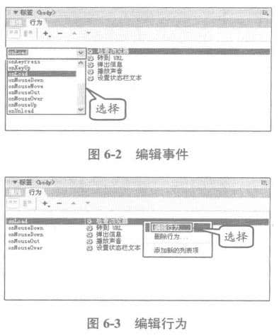 编辑一个行为的触发事件,可以直接在【行为】面板中选中添加的行为,点击该行为的触发事件,然后在弹出的下拉菜单中选择对应的事件或者直接在事件菜单文本框事件类型,如图6-2所示。