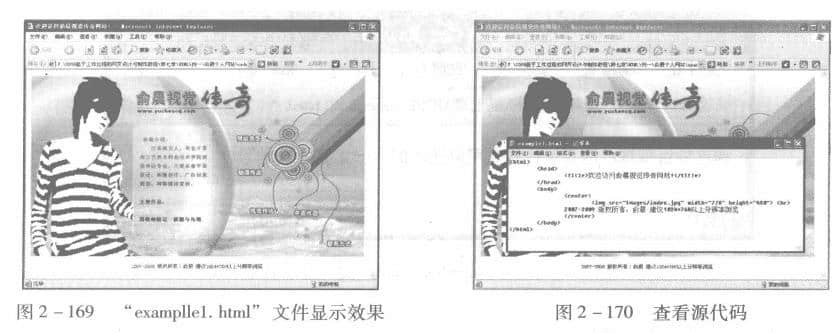 使用Dreamweave 切换到“代码”视图,您可以在其中编写相应的HTML 代码。对于专业的网页设计人员,可以在浏览器中选择“查看”-“源代码”命令,弹出以记事本形式显示的网页文件源代码,如图2-170所示。